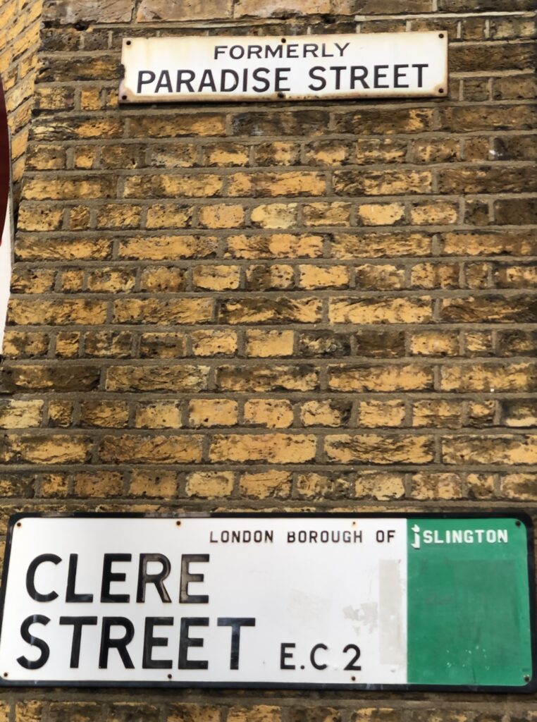 Clere Street is a turning off Tabernacle Street in Shoreditch, on the edge of the pre-1965 border between Finsbury and Shoreditch boroughs. It was previously called Paradise Street from c. 1792, then gained ‘Clere’ around 1938 when many London streets with confusing, duplicated and common names were renamed in an attempt at clarity.
