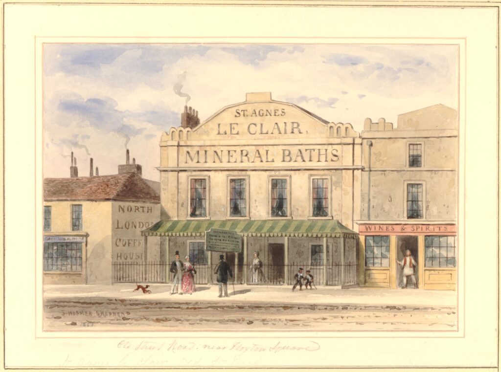 By the 1700s, wells and spas had become popular places to meet and socialise, often competing with each other for both the excellence of their buildings and surroundings, and for offering mineralised waters that cured many (or indeed all!) ailments. Sadler’s Wells, Bagnigge Wells, the Cold Bath and the Islington Spa were all local examples.